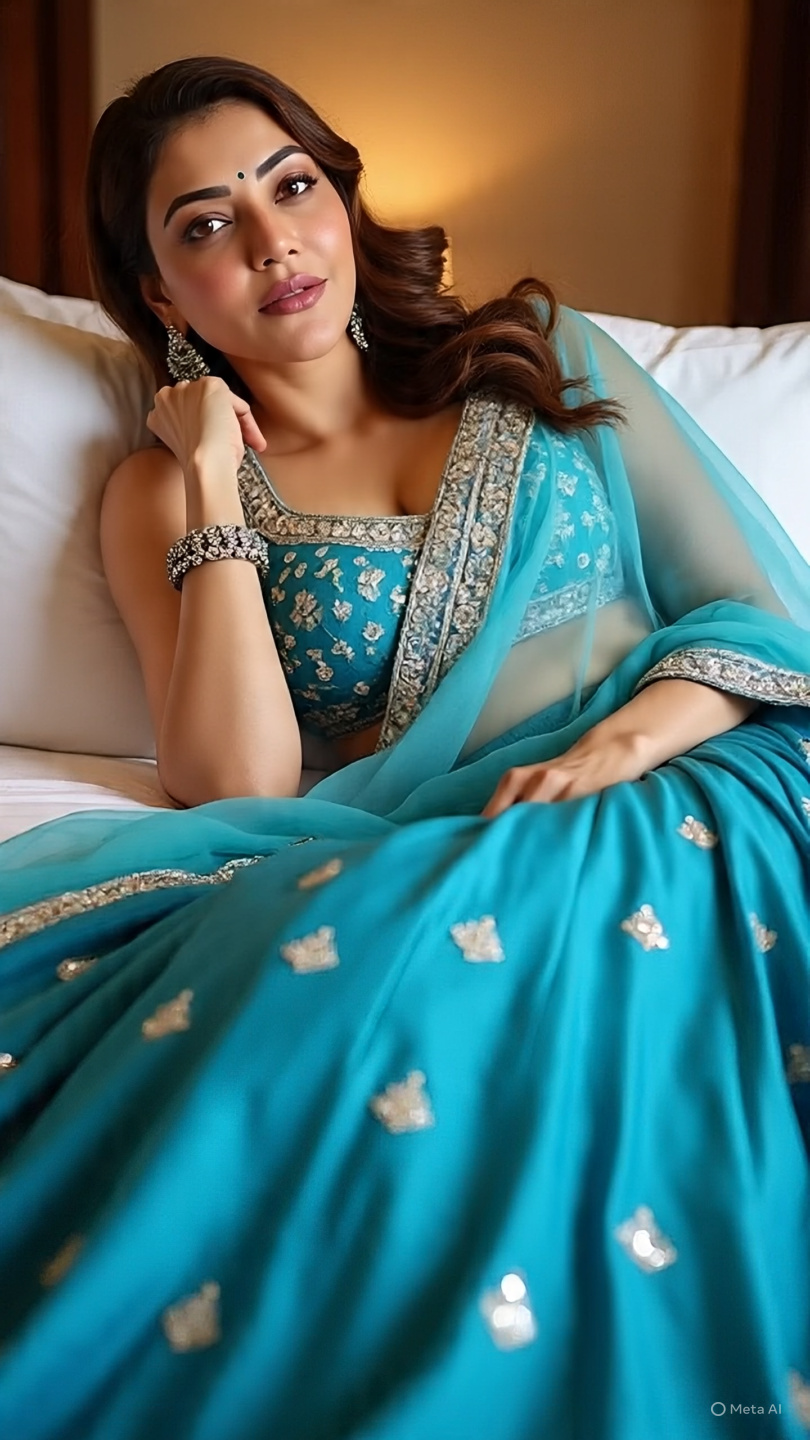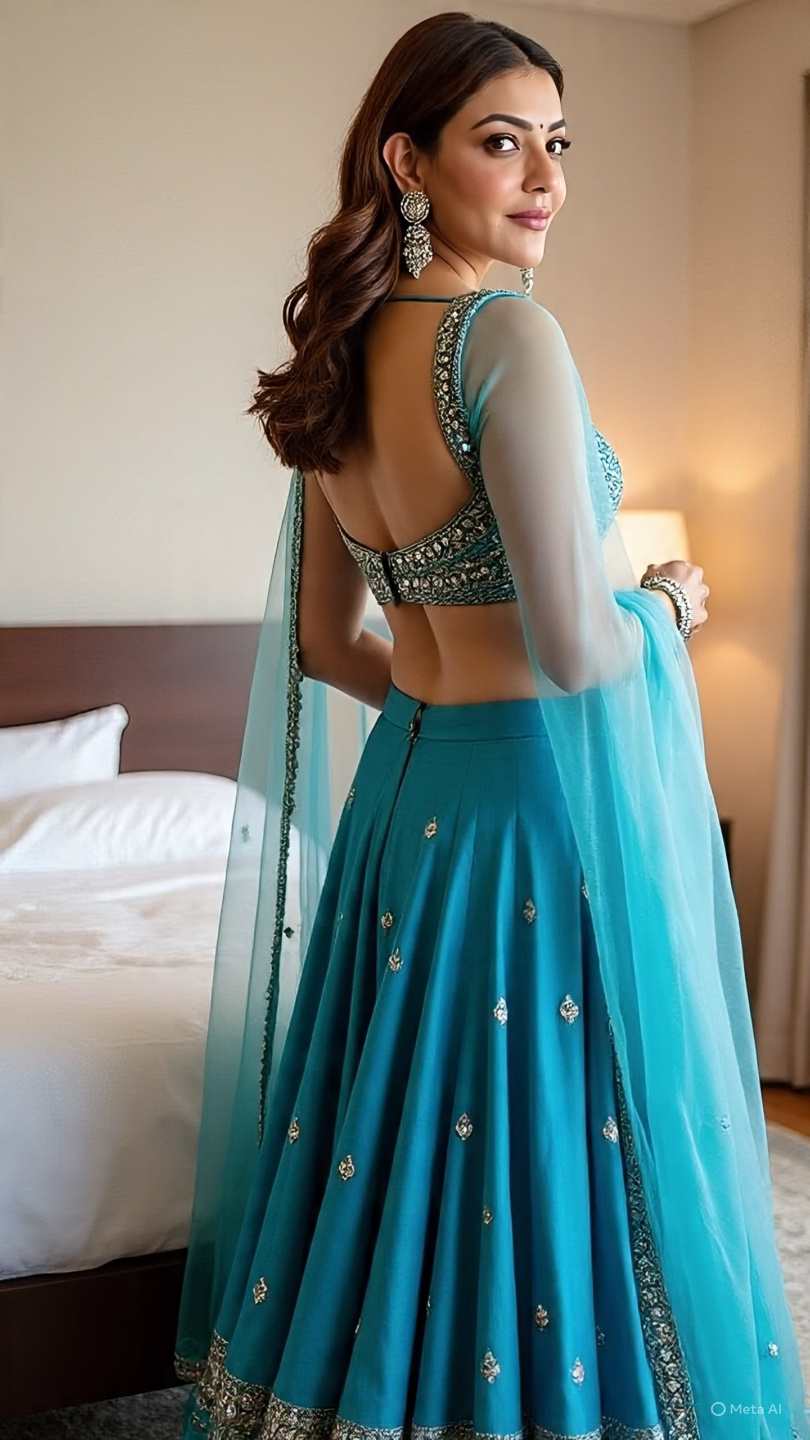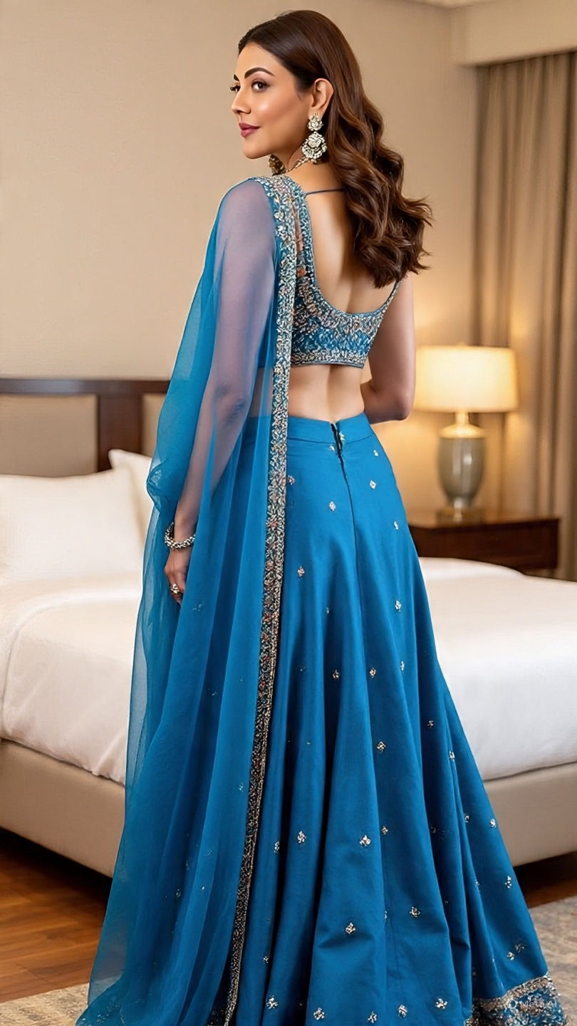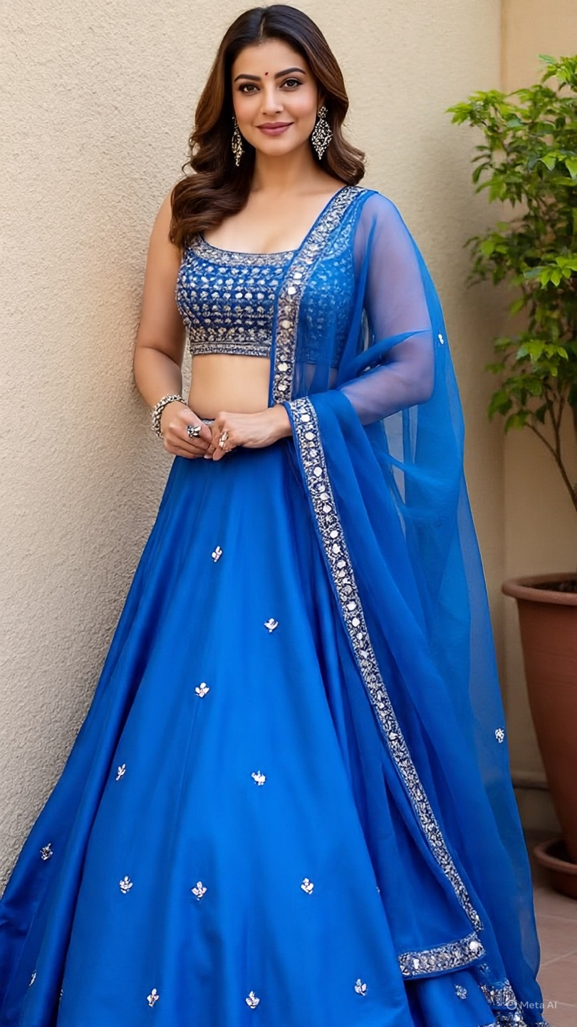 Whether it’s party wear, casual chic, or glamorous evening gowns, this Kajal Agarwal AI blue dress collection brings a mix of style and sophistication.