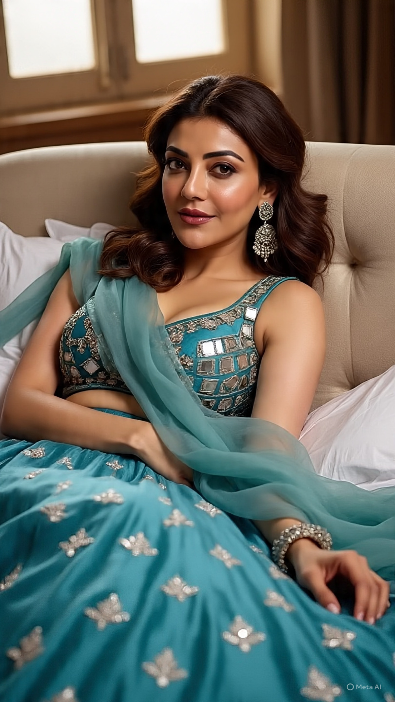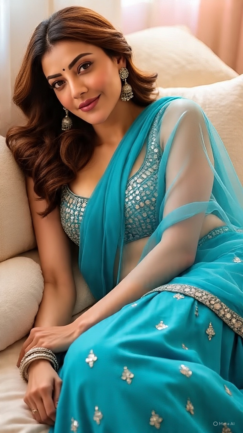 Download Kajal Agarwal AI wallpapers and HD fashion pics, ideal for desktops, mobiles, and social media use. These AI edits showcase her stunning beauty in trendy blue outfits.