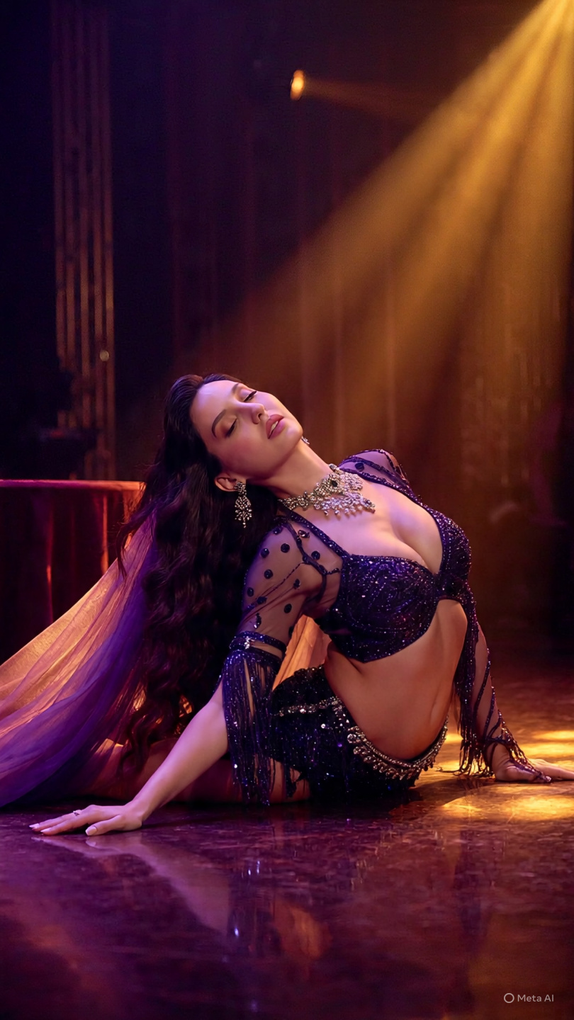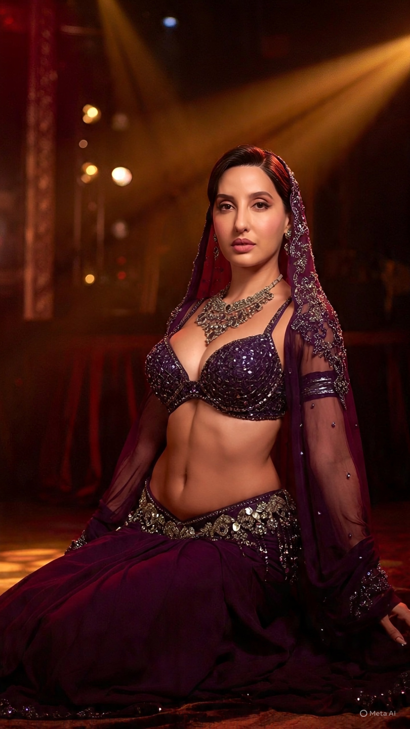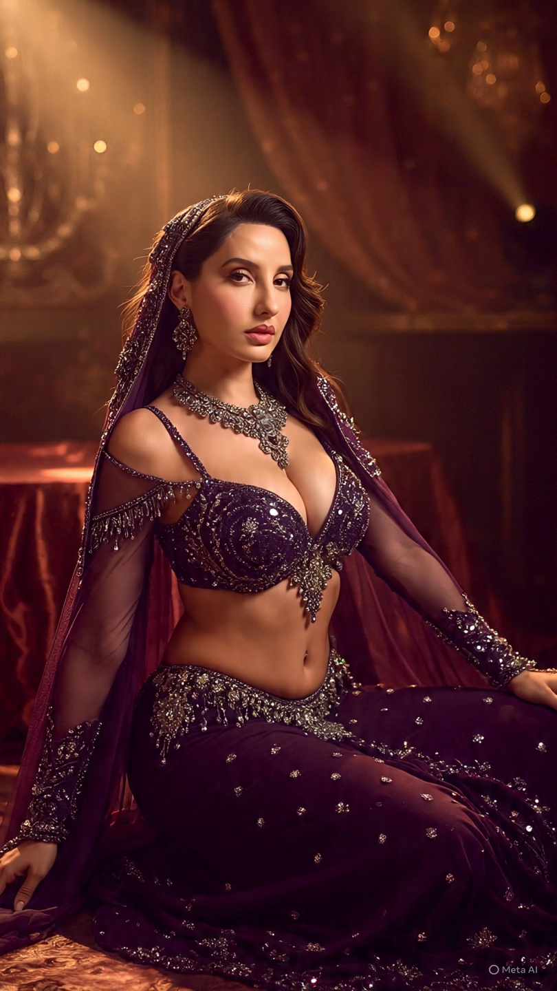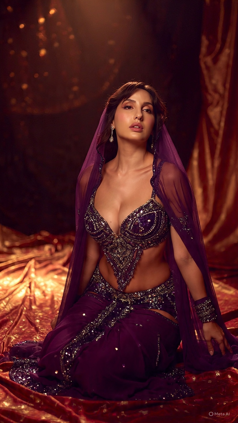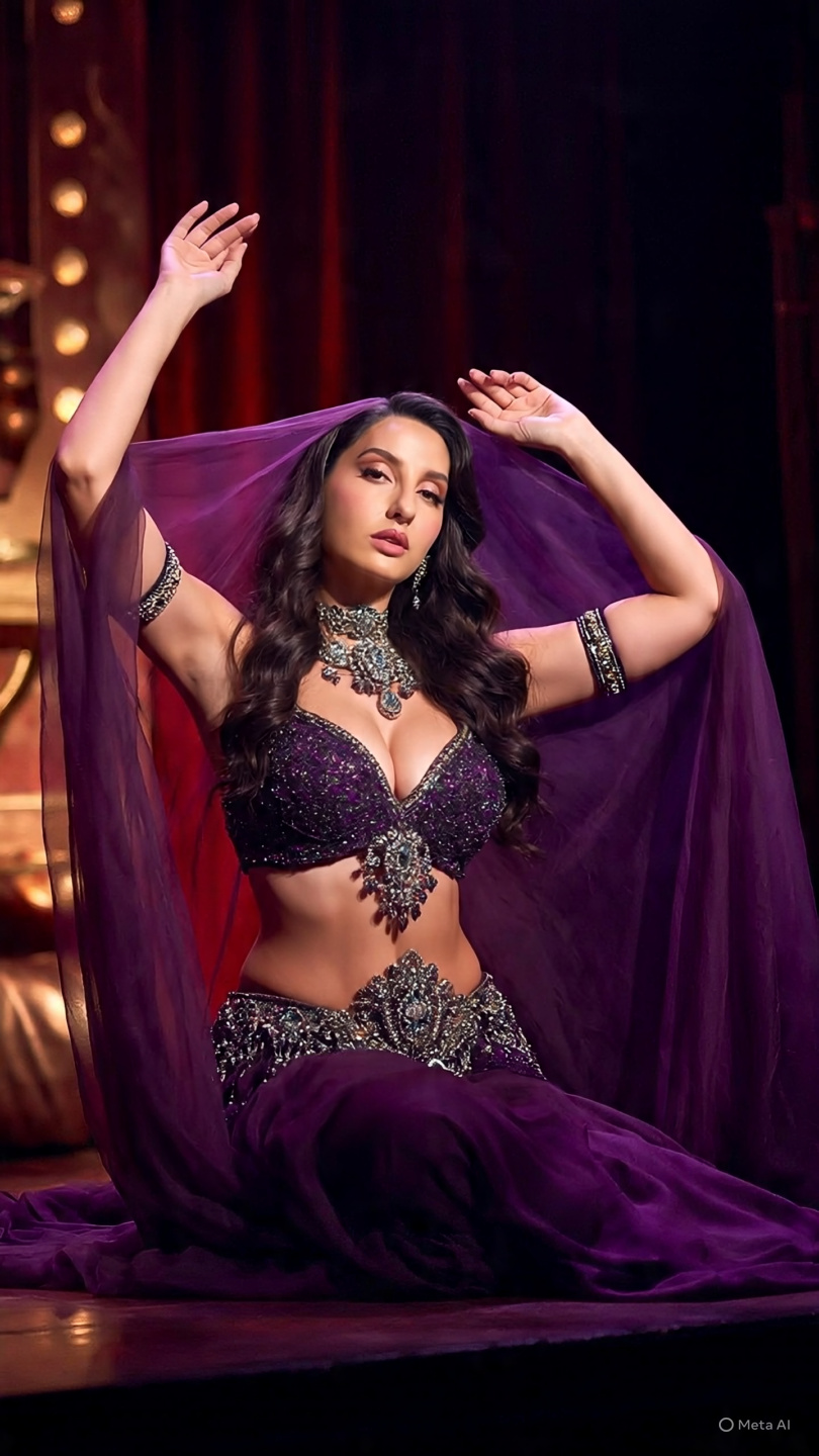 From energetic hip shimmies to graceful snake arms and powerful Turkish drops, these AI-generated photos showcase Nora in breathtaking belly dance poses wearing a dark purple embellished costume with sequins, embroidery, and flowing veil sleeves. Each image captures her elegance, strength, and expressive beauty, blending the art of Middle Eastern dance with Bollywood-inspired style.